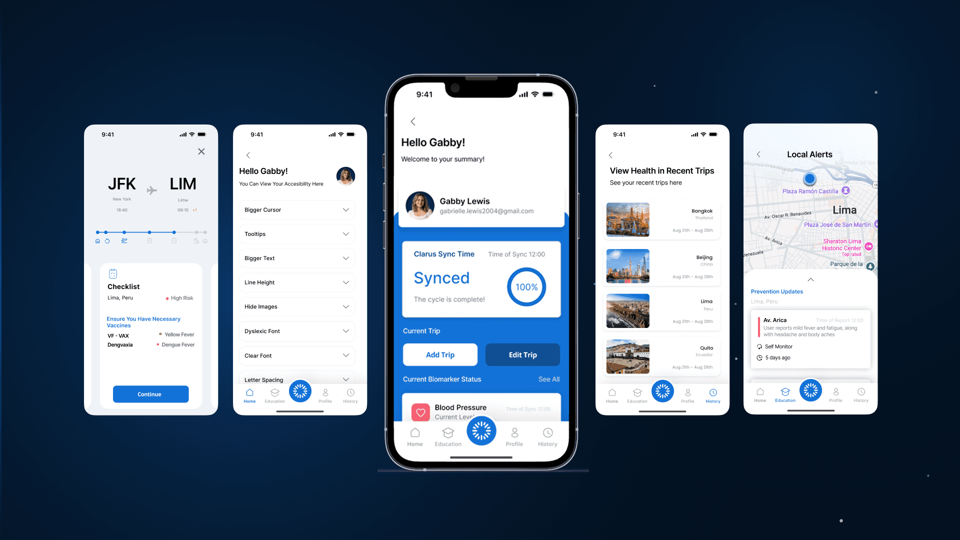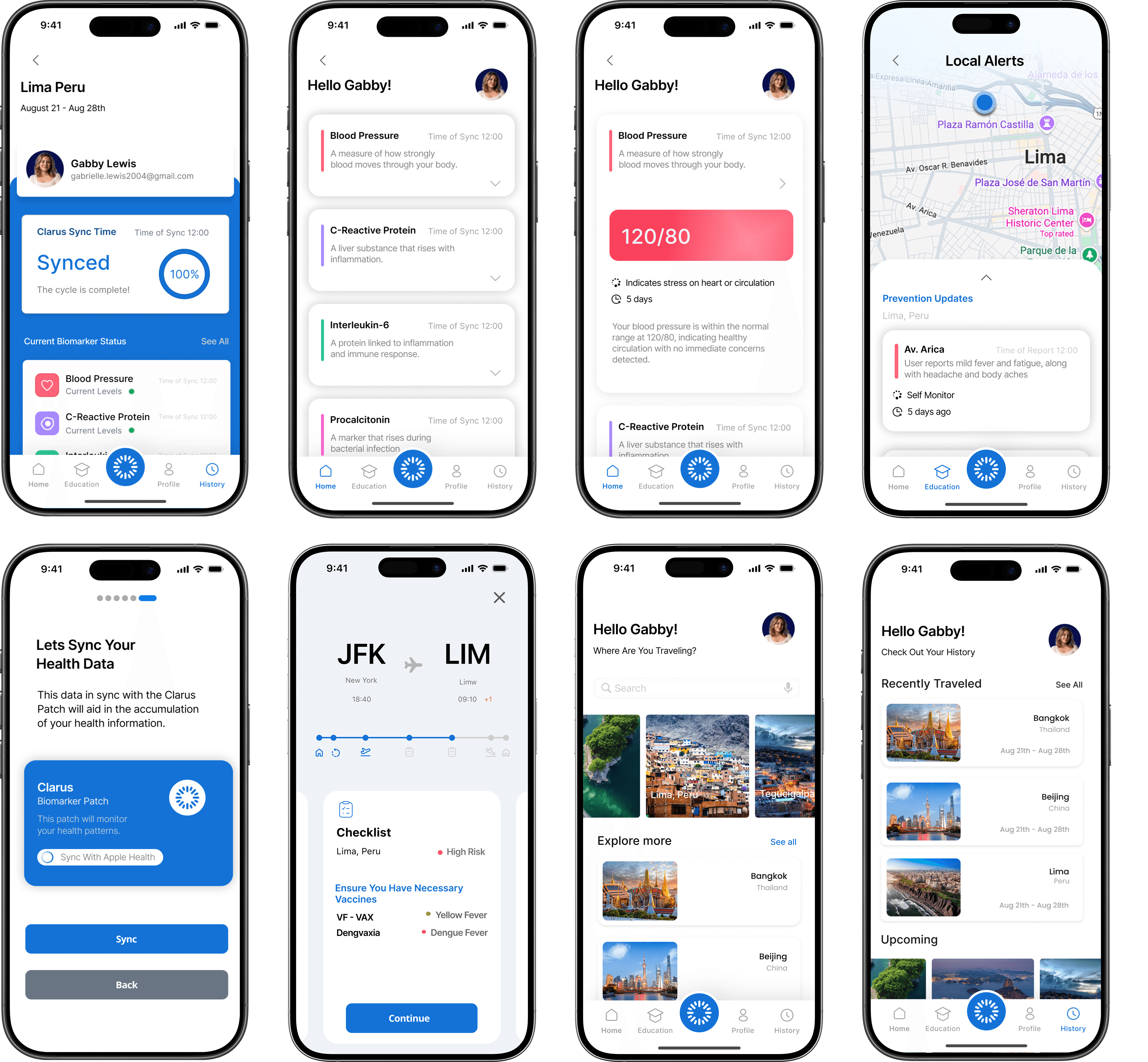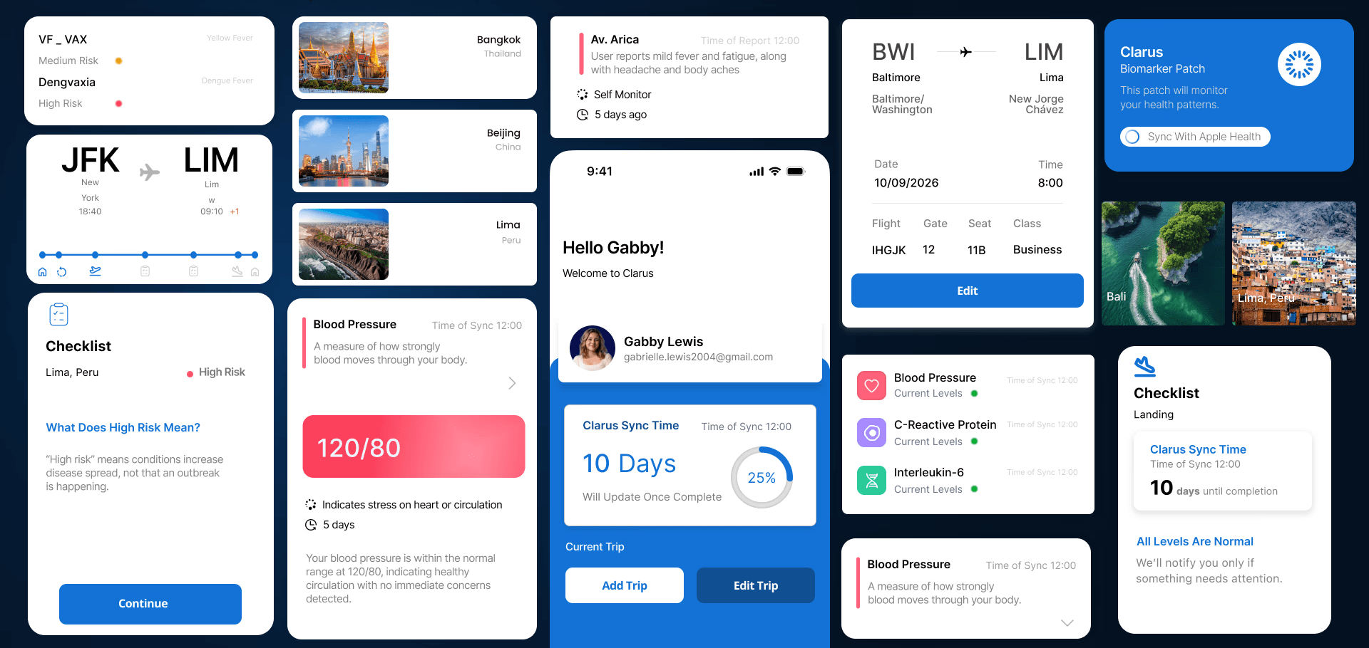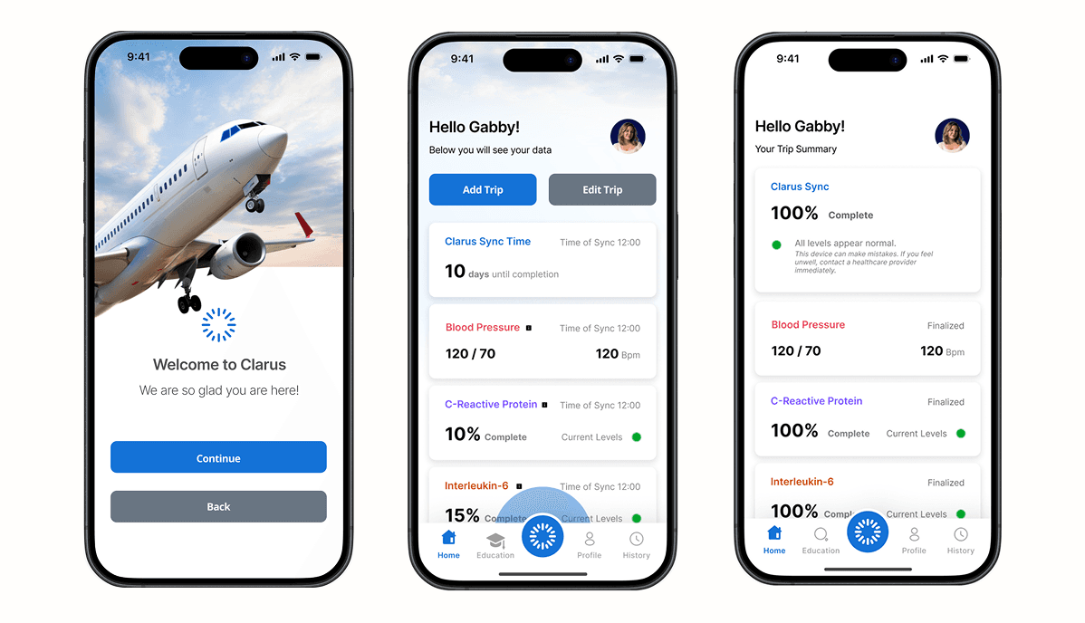 The Clarus app transforms real-time biosensor data into simple, actionable insights, giving travelers a clear understanding of their health throughout their journey. Designed for clarity and ease of use, it supports users from setup to monitoring with minimal effort and maximum confidence.