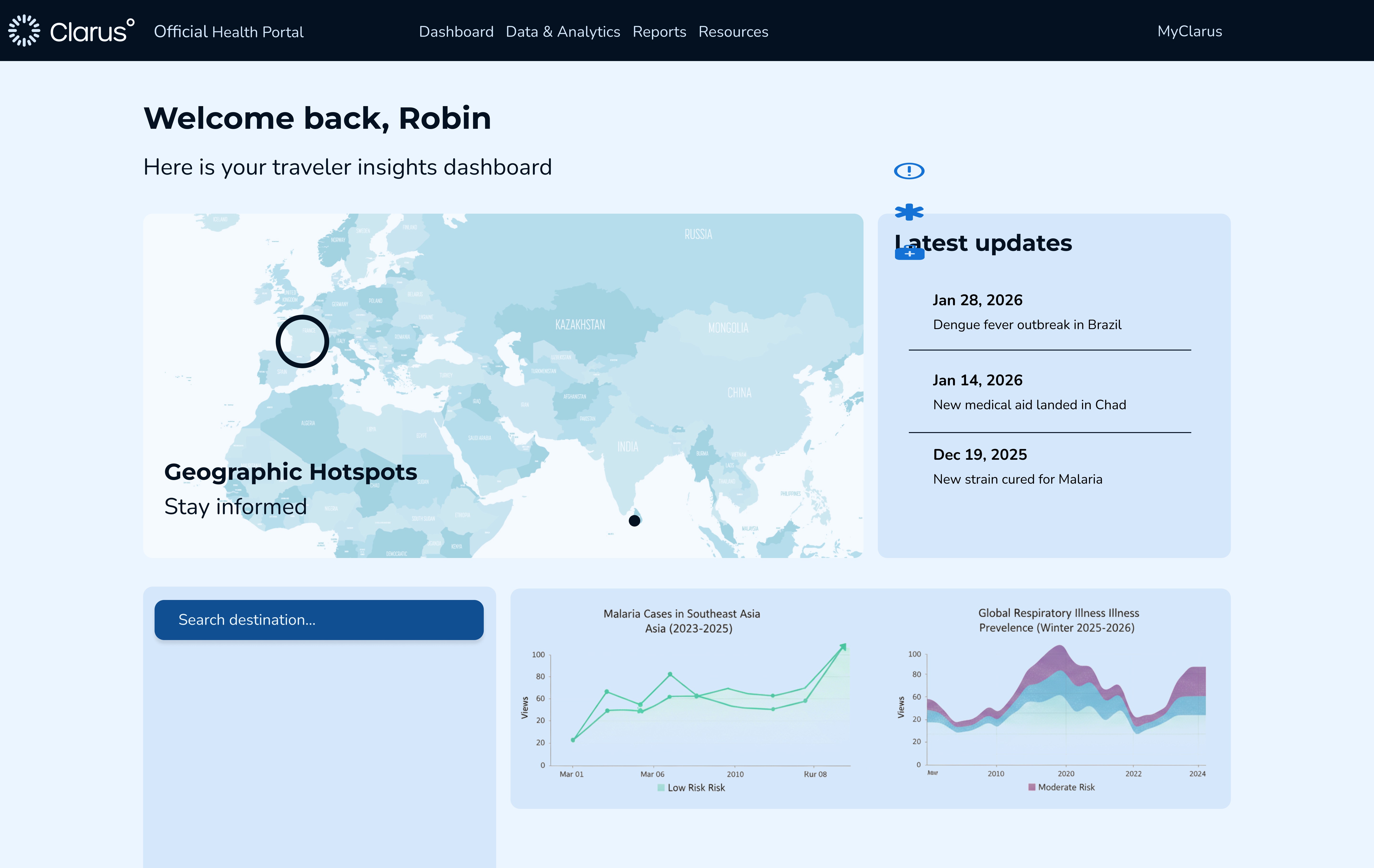 The Clarus platform gives health professionals a clear view of real-time, anonymized data from travelers. It helps them spot patterns earlier, understand trends faster, and make more informed decisions when it matters most.