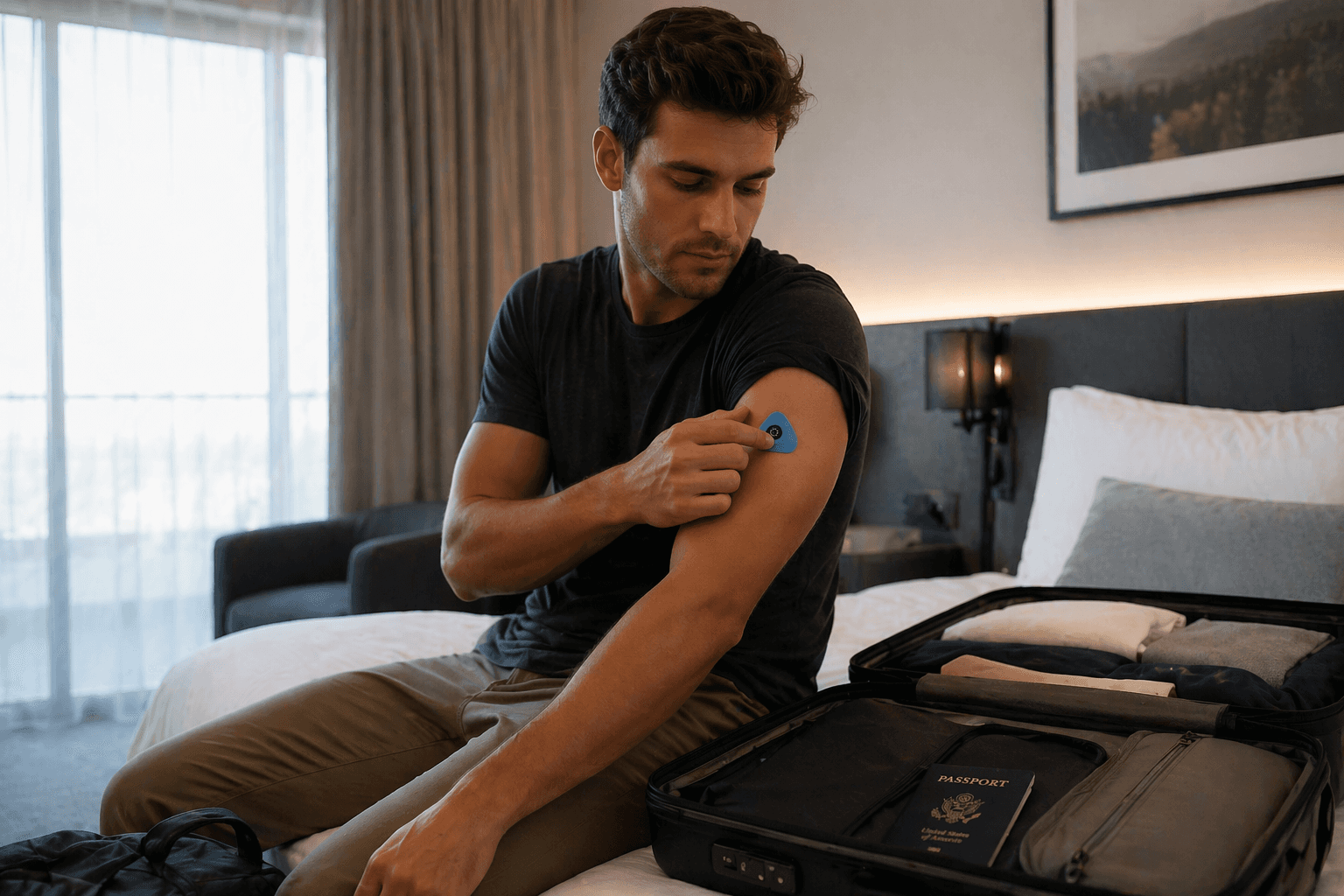 The user applies the microneedle patch before or during travel, integrating it seamlessly into their routine.